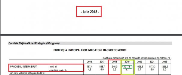Acum, în luna iulie, CNP a majorat din nou valorea PIB, la 945 miliarde de lei, însă a redus creşterea economică la 5,5%, exact la nivelul estimate în toamna anului trecut.  Acest lucru se poate explica prin aplicarea deflatorului PIB, adică evoluţia preţurilor pe baza cărora se calculează Produsul Intern Brut. În prognoza de toamnă deflatorul era de 2,1%, iar în actualizarea din iulie 2018, deflatorul este de 4,3%.