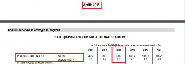Aici trebuie menţionat, că la construcţia bugetului pe 2018, autorităţile au ţinut cont de prognoza de toamnă, iar atunci creşterea economică era estimate pentru anul în curs la 5,5%, respective un PIB de 908 miliarde de lei. În primăvară, cei de la CNP au urcat estimarea la 930 miliarde de lei – valoare PIB, iar avansul economic la 6,1%.
