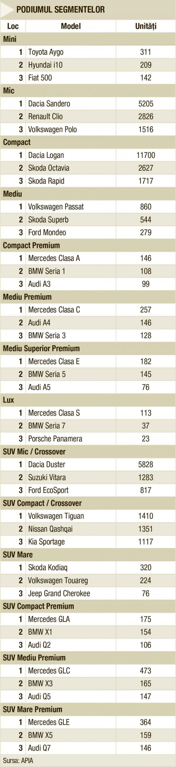 Din totalul de peste 234.000 de autoturisme de ocazie înmatriculate în acest an nu mai puţin de 59.265 de unităţi aparţin mărcii Volkswagen, aceasta fiind evident cea mai căutată marcă pe piaţa second-hand. Locul secund în clasamentul maşinilor de ocazie este ocupat de Opel, cu 25.309 unităţi, iar pe a treia poziţie se află BMW cu 22.239 unităţi. Urmează Audi (21.941 unităţi) şi Ford (21.743 unităţi).