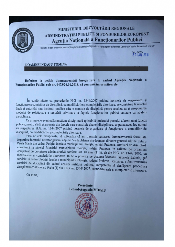 Mai mult, politista Tomina Neagu l-a introdus in Comisia de Disciplina de 3 ori pe directorul Adrian Vaida, una din acestea fiind finalizata cu sanctionarea managerului pentru hartuire (celelate doua comisii de disciplina fiind momentan blocate probabil la ordinul tansemului Adrian Dobre- primar PNL si a col ® SRI Pruna Eugen- consilierul acestuia, persoane care il mentin in functie in profida tuturor ilegalitatilor/hartuirilor/hartuirilor sexuale si al limbajului suburban al acestuia fata de subordonati).