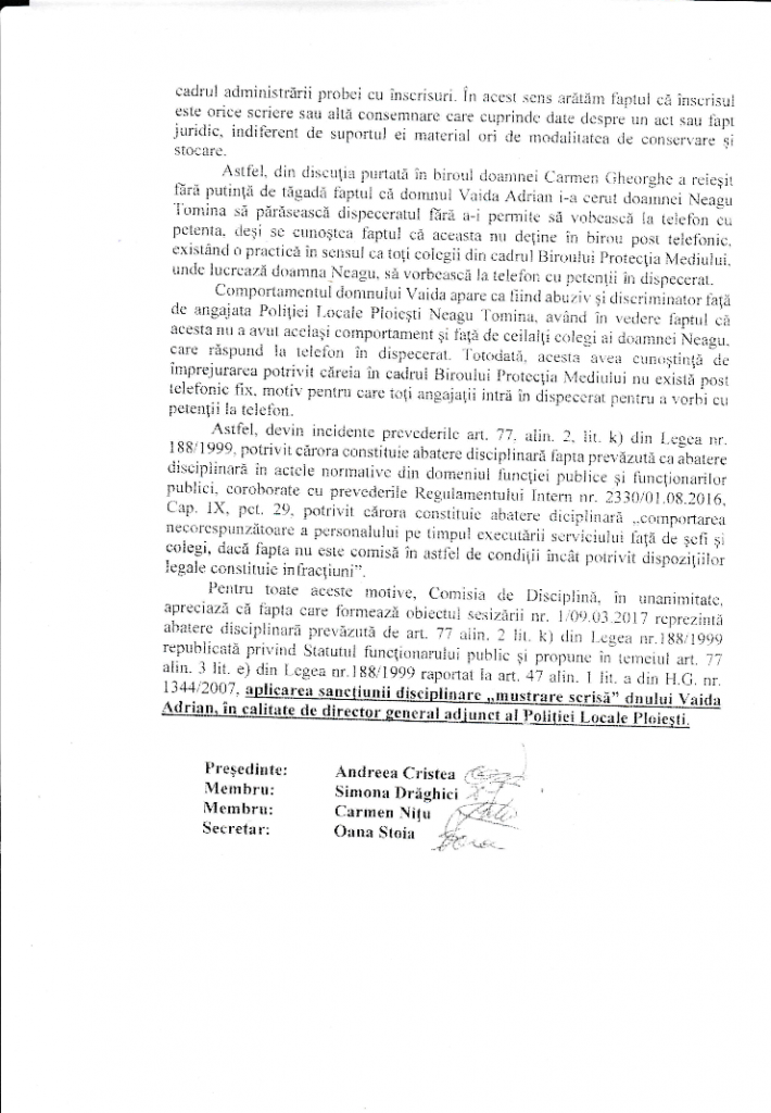 - Aceste inregistrari audio si stenograme precum si cele care vor urma demonstreaza fara echivoc ca introducerea celor doi politisti locali in comisia de disciplina este o razbunarea a hartuitorului Adrian Vaida care ar tinde sa si “ii omoare”!