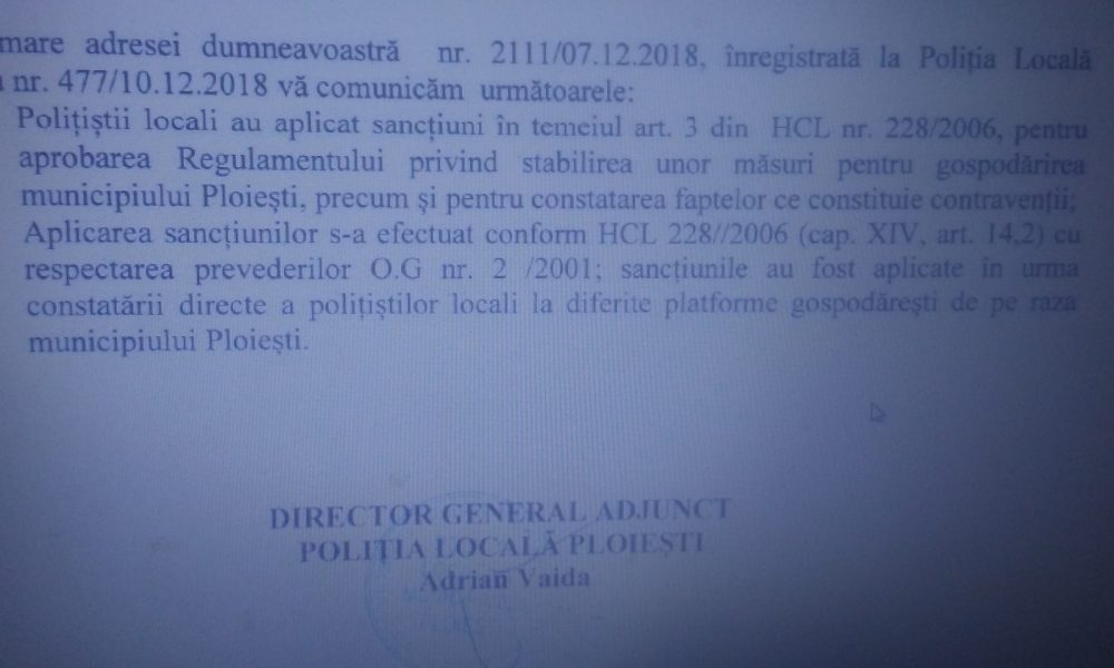 In fapt a aruncat vina pe subordonati exact cum va dezvaluiam in articolele anterioare: “sanctiunile au fost aplicate in urma constatarii directe a politistilor locali la diferite platform gospodaresti de pe raza municipiului Ploiesti”.
