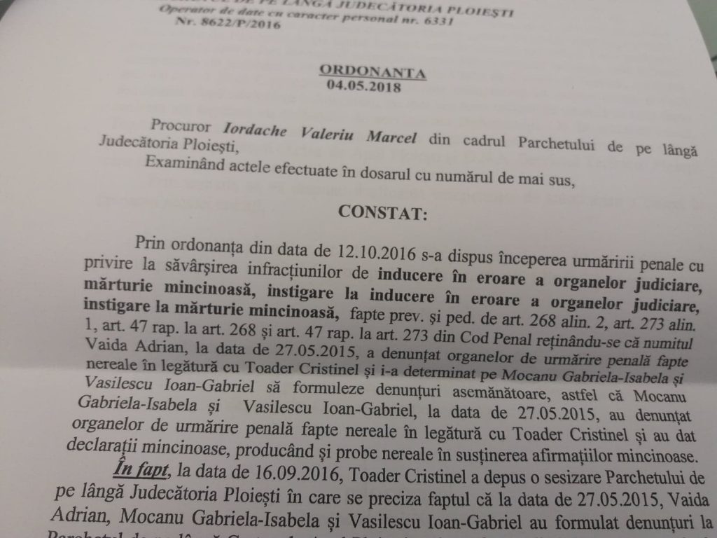 Reamintim cititorilor ca, denuntatorii mincinosi Adrian Vaida (director general adjunct (“interimar”) al Politiei Locale Ploiesti, Mocanu Gabriela Isabela (sefa Oficiului Juridic) si secretara “jucausa” a institutiei, Vasilescu Gabriel, sunt urmariti penal de Parchetul General pentru savarsirea infractiunilor de inducere in eroare a organelor judiciare, marturie mincinoasa, instigare la inducerea in eroare a organelor judiciare, instigare la marturie mincinoasa, fapte prevazute si pedepsite de art 268 aln 2, art 273 alin 1, art 47 raportat la art 268 si art 47 raportat la art 273 Cod Penal, ca urmare a declinarii dosarului penal nr.8622/P/2016 de la Parchetul de pe langa Judecatoria Ploiesti catre aceasta institutie.