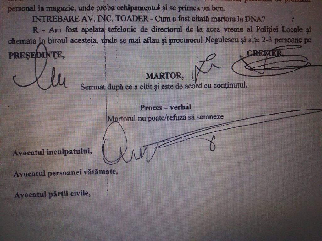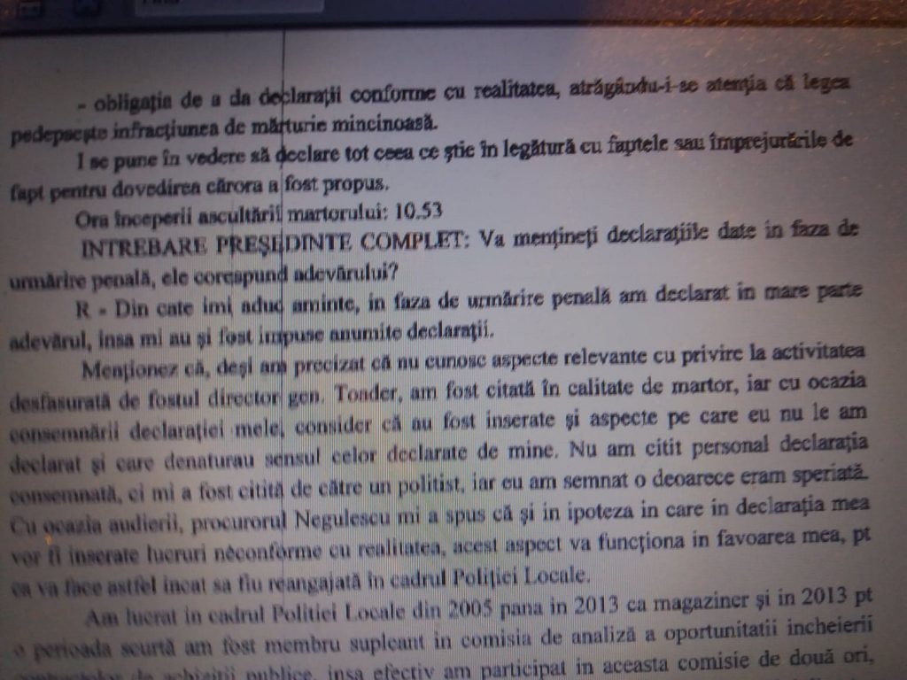 Raspuns martor Stegaru Ionela: – Am fost apalata telephonic de directorul de la aceea vreme a Politiei Locale si chemata in biroul acesteia, unde se mai aflau 2-3 persoane pe care nu le cunosteam si mi s-a solicitat sa merg la sediul DNA pentru a purta niste discutii referitoare la actrivitatea fostului director Toader Cristinel. Desi am mentionat ca, fiind plecata din 2013 din institutie, nu pot furniza declaratii deoarece nu cunosc aspect despre activitatea numitului Toader C., mi s-a spus ca trebuie sa merg sa dau declaratie. Procurorul Negulescu Mirceami-a spus ca fostul director mi-a facut mult rau si prin urmare trebuie sa procedez si eu in mod similar.