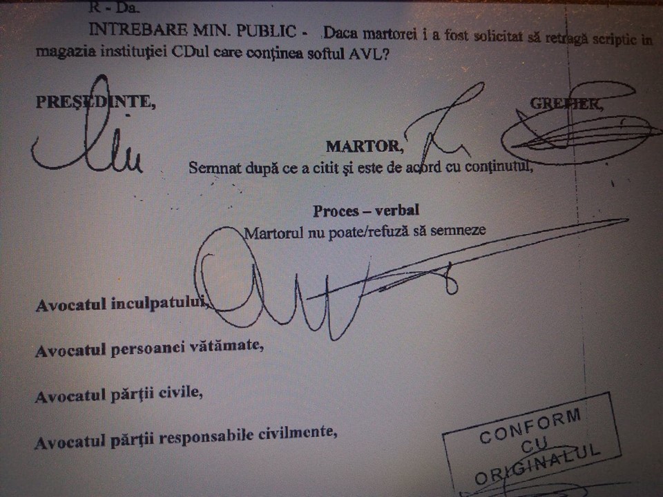 “Da, este adevarat ca numitul Barbu Gabriel, inainte de a parasi Politia Locala Ploiesti pentru a se angaja in alt loc de munca mi-a solicitat sa intocmesc un document prin care sa attest intrarea CD-ului continand soft AVL. Cunoscand anterior acestui fapt de la numita Nicolae Evelina ca acest CD nu mai exista faptic in Politia Locala, am refuzat sa fac acest lucru si mi-am dat demisia….”