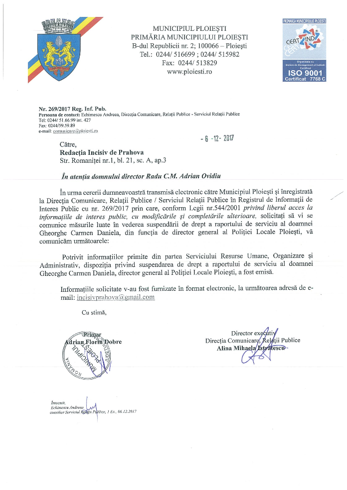In aceeasi data (04.12.2017) a fost emisa Dispozitia primarului municipiului Ploiesti cu nr 24446 privind suspendarea raportului de serviciu.