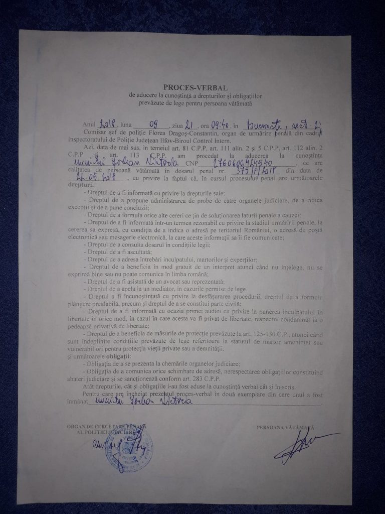 Precizam de asemenea ca, polițistul ASP Anghel Mihai din cadrul Postului de Poliție Branesti adreseaza aceste injurii cu conotatii sexuale pentru intimidare, fostului sef de post al Politiei Branesti care este sotul politistei locale Serban Victoria de la Politia Locala Branesti, persoana care a fost agresata de acest cadru MAI (ASP Anghel Mihai), dosarul penal fiind pe rolul Parchetului de pe langa Tribunalul Ilfov, inregistrat sub nr 375/P/2018.