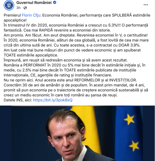 - Și, desigur, pe surse alternative, economia României a scăzut ,,doar” cu -3,9% în 2020, ceea ce realmente reprezintă o ,,performanță” fantastică: care nu există în realitate, plăsmuită, ireală, dezvaluie analistul economic Radu Teodor Soviani. (Crsitina T.).