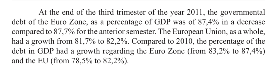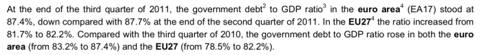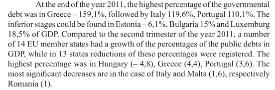 - Conținutul copiat și distorsionat (comunicatul Eurostat se referă la datoria publică la sfârșitul trimestrului III, iar conținutul copiat susține aceleași procente, dar pentru întreg anul 2011):