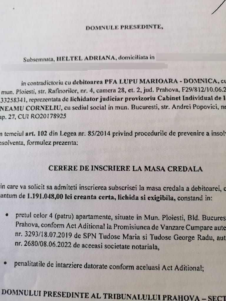 În acelasi timp, la Tribunalul Prahova se deschidea dosarul nr. 3418/105/2023, privind falimentul LUPU MĂRIOARA DOMNICA PFA, „dezvoltatorul” imobiliar al WHITE TOWER. Doar că din acest dosar, documentele contabile lipsesc, pentru ca bătrânica milioanară a refuzat sa le predea lichidatorului, un indiciu clar ca in spatele afacerii se desfășoară un joc periculos. O privire atentă în dosar demonstrează că plățile făcute de Baba Superemă sunt învăluite în mister și demonstrează multe fraude. Fraude pe care primarul ANDREI VOLOSEVICI nu le-a băgat în seamă nici când a acceptat ca faimosul PFA LUPU MĂRIOARA să sponsorizeze renovarea unui loc de joacă în municipiul Ploiești și nici când a anunțat cu mare tam-tam că pensionarii vor beneficia de analize sponsorizate de aceeasi societate. (Analize care au prejudiciat SPITALUL SCHULLER cu o sumă frumușică pentru că Baba a uitat să își onoreze sponsorizarea. Dar despre această poveste într-un alt episod! )
