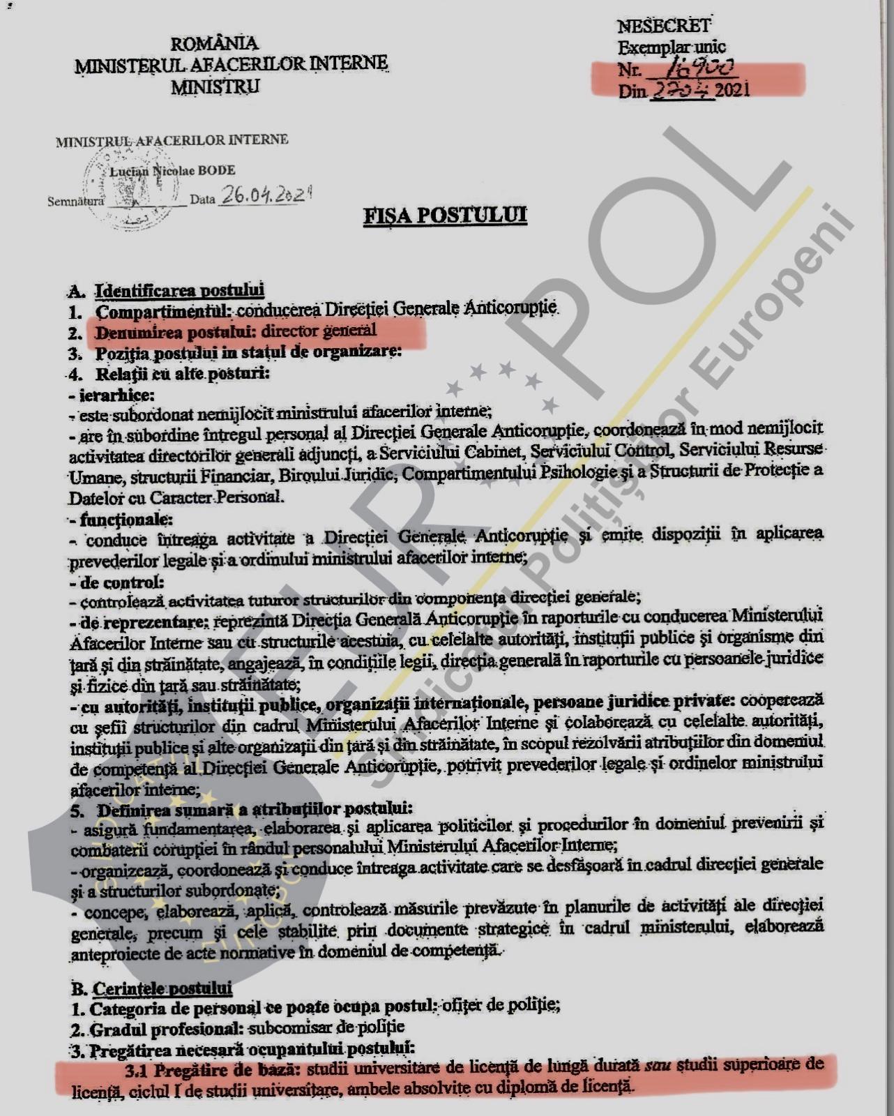 În acest context, în luna aprilie 2021, brusc și dintr-o dată, se constituie prin ordin al ministrului , o comisie de analiză a postului pentru funcția de director general al DGA. Evident, în mod nejustificat și cu suspiciuni de „dedicație” se elimină principala condiție de studii. Cu alte cuvinte, comisia constata că nu e nevoie ca directorul general al DGA să dețină studii juridice, economice, militare, de informații și ordine publică, ci este suficient să dețină STUDII SUPERIOARE,dezvaluieceidelaEuropol.